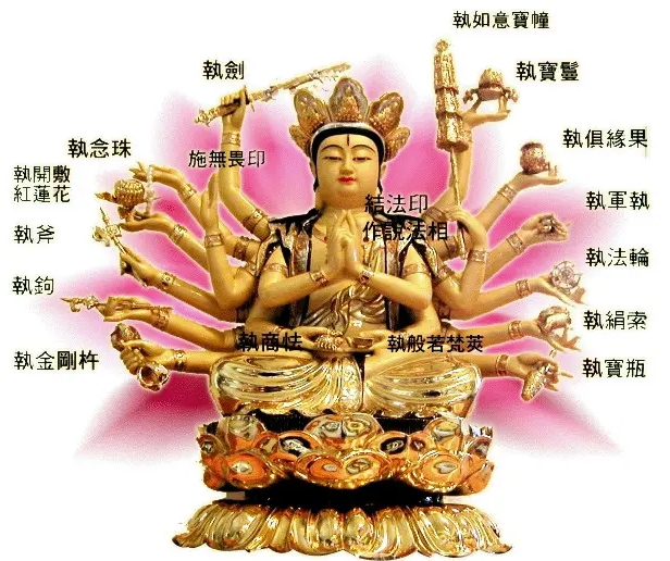 右第三手把剑,此剑乃智慧剑,降断三障四魔,除三毒五欲,故持此剑。